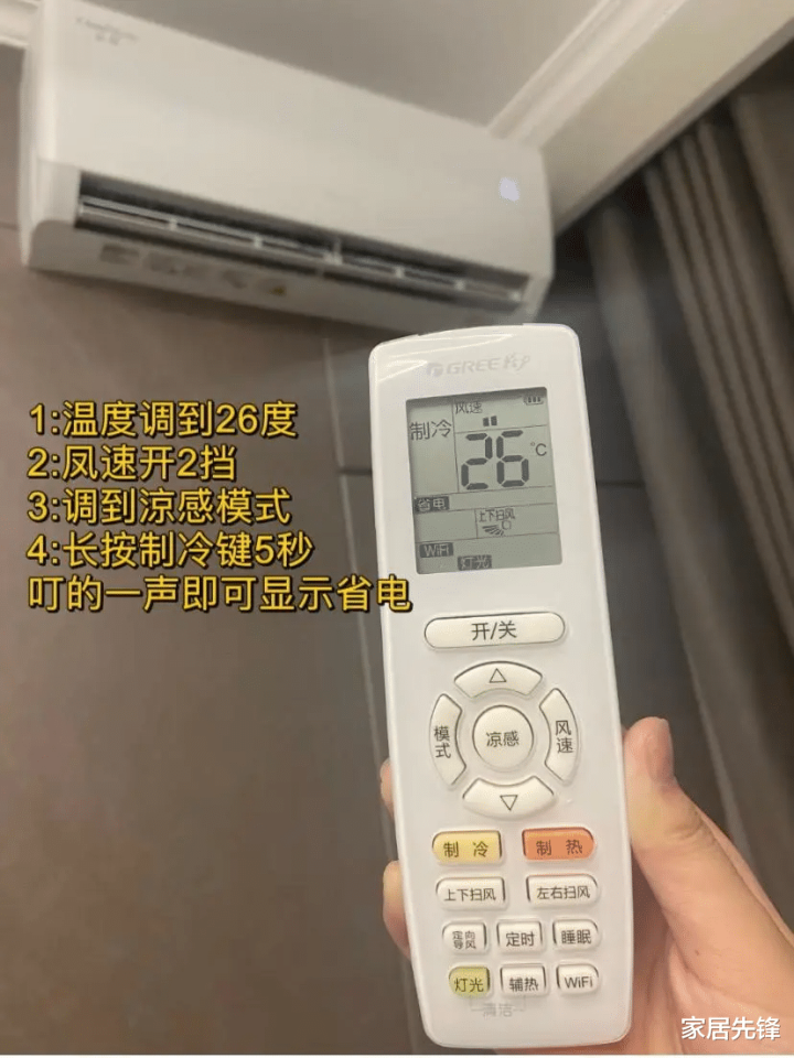 每次的开关空调都会消耗更多的电力去重新启动空调的压缩机,这样做非常费电,所以大家在临走前可以将温度调至28度,长按遥控器的制冷键3秒开启节能模式,风速调至自动或者是低速。